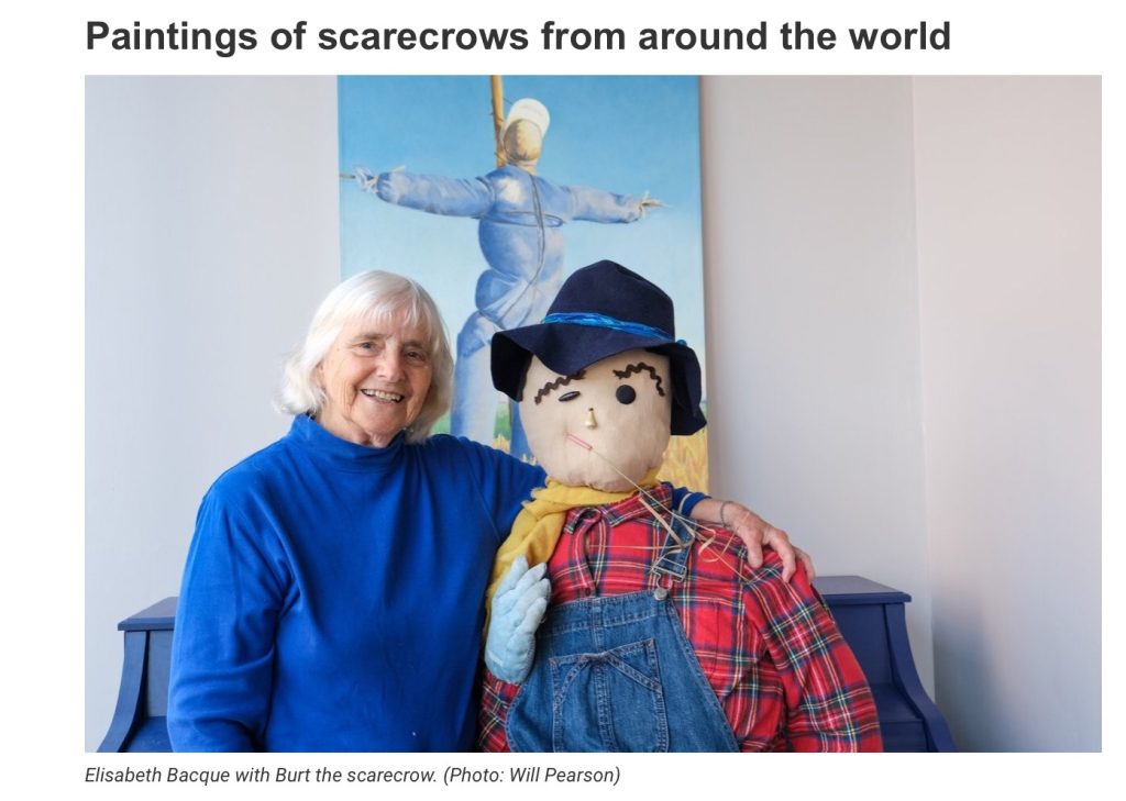 The series of paintings Gardens and Scarecrows was first shown in the Civic Garden Centre in Toronto. Interesting visual metaphors emerge in the scarecrows: in France, a roadside cross or calvaire; in Quebec, a sorceress; in Poland, a victim; and in the United States, a makeshift war grave.
